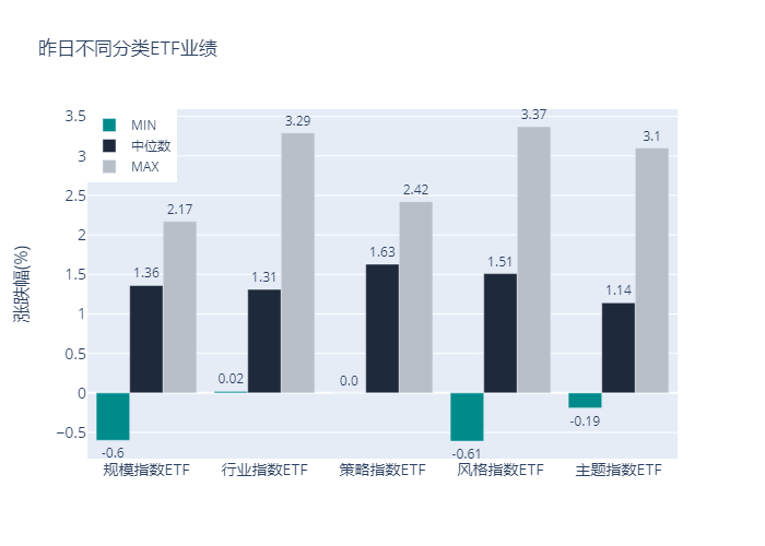 昨日股票型ETF收益率中位数为1.28%。其中按照不同分类,规模指数中博时上证超大盘ETF收益率最高,为2.17%;行业指数中万家中证工业有色金属主题ETF收益率最高,为3.29%;策略指数中国泰富时中国国企开放共赢ETF收益率最高,为2.42%;风格指数中招商中证银行AH价格优选ETF收益率最高,为3.37%;主题指数中华富中证稀有金属主题ETF收益率最高,为3.1%。