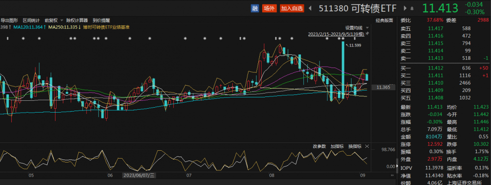 债券市场方面,中证转债及可交换债(931078)强势,跟踪该指数的可转债ETF(511380)下跌0.30%,盘中持续溢价,溢折率为0.13%,成交额突破8100万元,换手率1.75%。