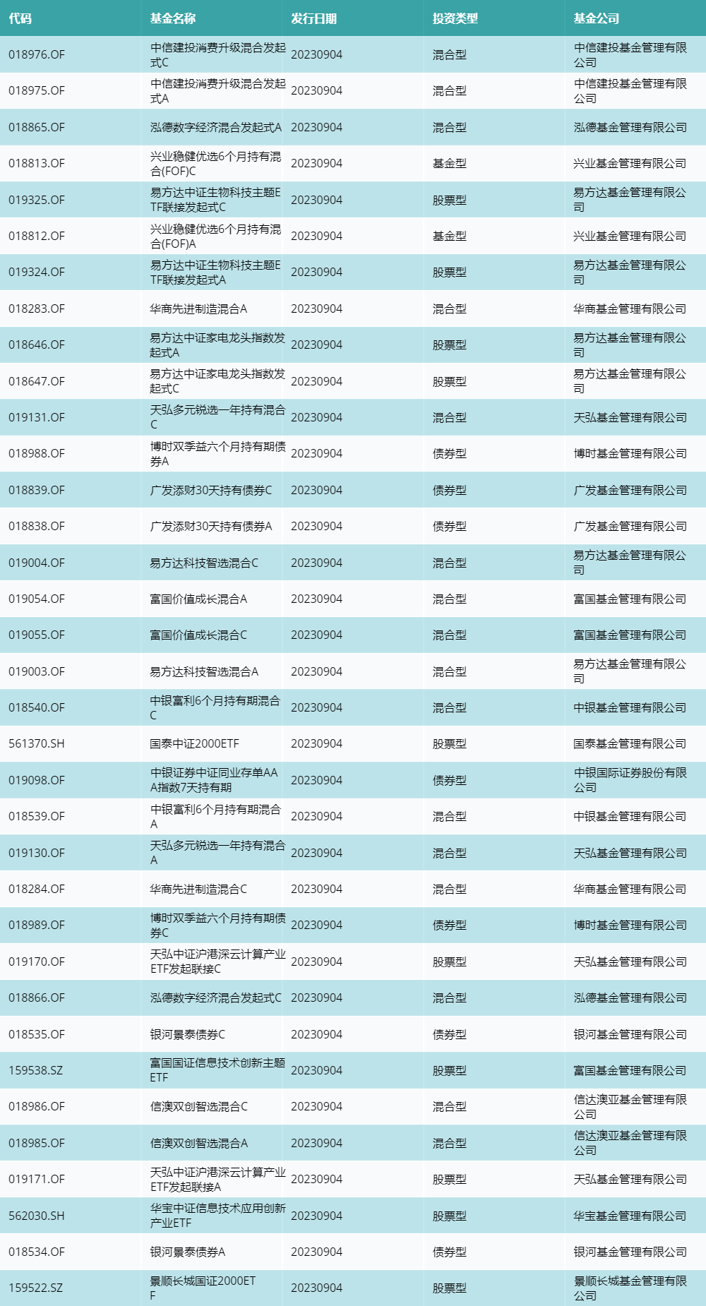 9月4日有35只新基金发行,分别为:中信建投消费升级混合发起式C、中信建投消费升级混合发起式A、泓德数字经济混合发起式A、兴业稳健优选6个月持有混合(FOF)C、易方达中证生物科技主题ETF联接发起式C、兴业稳健优选6个月持有混合(FOF)A、易方达中证生物科技主题ETF联接发起式A、华商先进制造混合A、易方达中证家电龙头指数发起式A、易方达中证家电龙头指数发起式C、天弘多元锐选一年持有混合C、博时双季益六个月持有期债券A、广发添财30天持有债券C、广发添财30天持有债券A、易方达科技智选混合C、富国价值成长混合A、富国价值成长混合C、易方达科技智选混合A、中银富利6个月持有期混合C、国泰中证2000ETF、中银证券中证同业存单AAA指数7天持有期、中银富利6个月持有期混合A、天弘多元锐选一年持有混合A、华商先进制造混合C、博时双季益六个月持有期债券C、天弘中证沪港深云计算产业ETF发起联接C、泓德数字经济混合发起式C、银河景泰债券C、富国国证信息技术创新主题ETF、信澳双创智选混合C、信澳双创智选混合A、天弘中证沪港深云计算产业ETF发起联接A、华宝中证信息技术应用创新产业ETF、银河景泰债券A、景顺长城国证2000ETF,详情见下表: