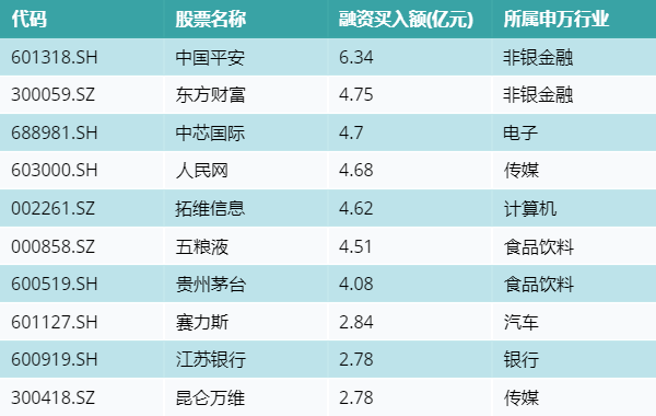 9月4日两市共有3277只个股有融资资金买入,其中中国平安、东方财富、中芯国际排名前三,买入金额分别6.34亿元、4.75亿元、4.7亿元。融资买入额前10个股详情见下表: