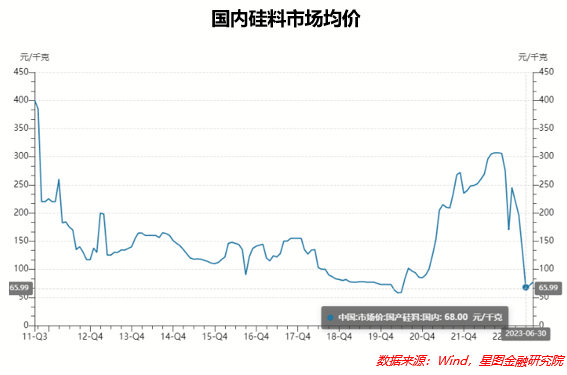 在2020年国内确定“碳30·60”目标后,以及随之全球各国对于双碳目标的确立,催生了全球新能源的行情。光伏就是其中最大的受益者之一,叠加上欧美双反政策的取消,中国光伏在全球市场中一家独大,硅料、硅片、电池片、组件等全产业主料和辅料市场占有率均在85%-95%不等。暴涨的下游需求率先让最上游的硅料收益,从2019年至今,硅料价格从最低点的约6万元/吨最高涨至2022年9月的30万元/吨,随后又跌至近期的7万元/吨。