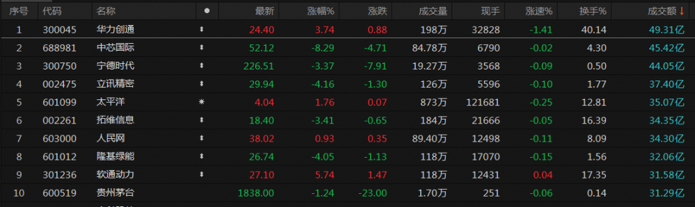 沪深两市今日成交额7668亿,较上个交易日缩量45亿。华力创通成交额居首,为49.31亿元。其次是中芯国际、宁德时代、立讯精密、太平洋,成交额分别为45.42亿元、44.05亿元、37.40亿元、35.07亿元。