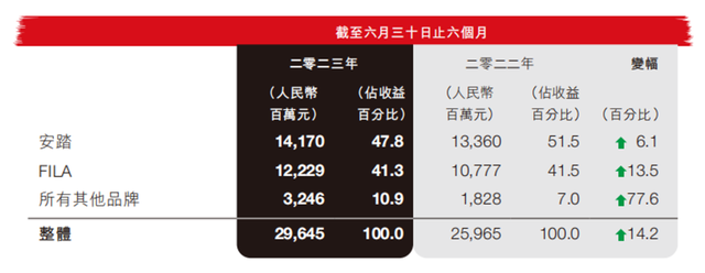 2023上半年,安踏营收296.5亿元,同比增长14.2%,比第二名耐克中国多出20亿元,比李宁和阿迪达斯的总和多出约30亿元;股东应占溢利47.48亿元,同比大幅增长32.33%。