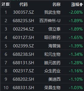 医药股早盘跌多涨少。相关指数中,中证创新药产业指数(931152)盘中下跌。截至发稿,成分股中,我武生物跌超2%,百济神州-U、信立泰、昭衍新药、海普瑞、和元生物、皓元医药等多股跌逾1%;智飞生物、贝达药业逆势走高,涨幅均超2%。