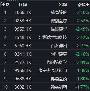 港股方面,医疗医药股同样多数走低。截至发稿,相关指数中,中证港股通医药卫生综合指数 (930965)跌超1%。成分股中,威高股份跌超3%,微创医疗、诺诚健华、金斯瑞生物科技、百济神州、阿里健康、微创脑科学跌逾2%;诺辉健康、国药控股、时代天使等逆势上涨。