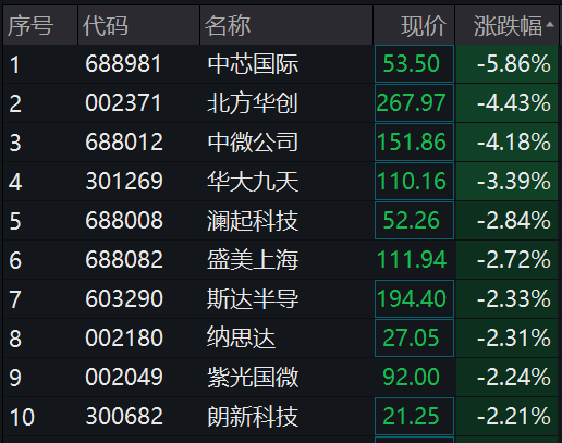 其中,中芯国际跌超5%,北方华创、中微公司跌超4%,华大九天跌超3%,澜起科技、盛美上海、斯达半导等股跟跌。