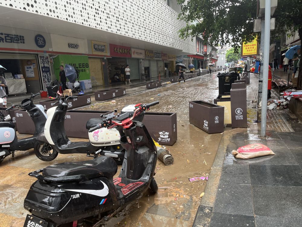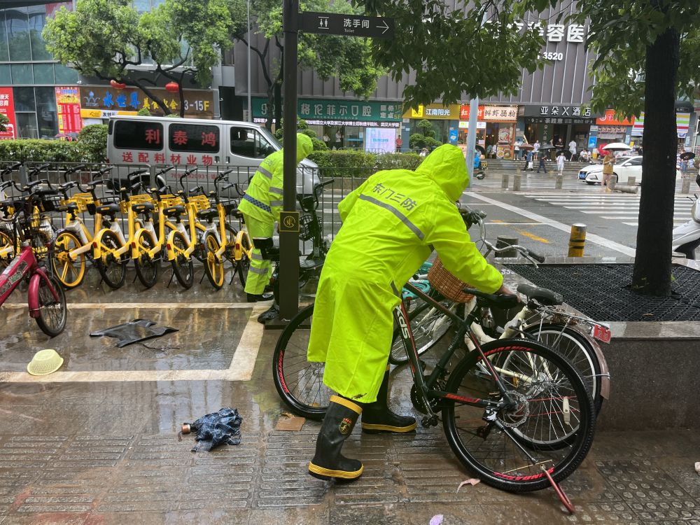 身着“东门三防”雨衣的工作人员在东门步行街附近扶起街边倒地的自行车