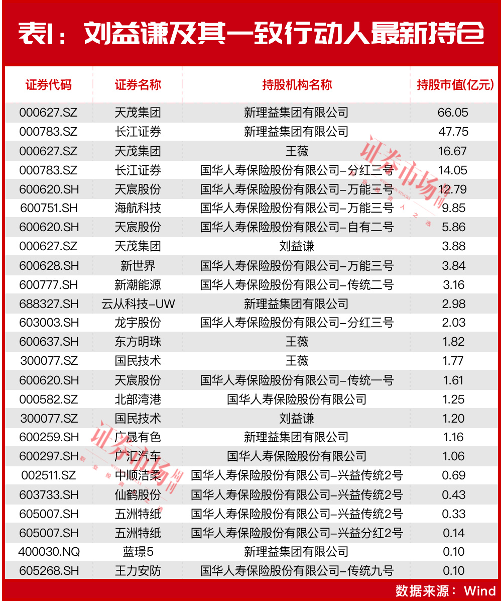 上市公司公告显示,刘益谦为新理益集团有限公司(以下简称“新理益”)和国华人寿保险股份有限公司(以下简称“国华人寿”)实际控制人,王薇为刘益谦的配偶,四者构成一致行动人。在今年二季度末,四者频频现身,据Wind统计,刘益谦及其一致行动人共出现在18家上市公司的前十大流通股股东名单,合计持仓市值达200.57亿元(见表1)。