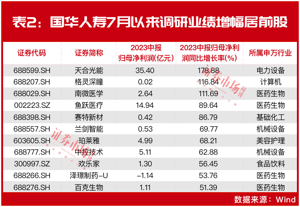 统计数据显示,在国华人寿参与的52次机构调研中,共涉及50家上市公司,其中步科股份和泽璟制药-U均获得两次调研。而在今年上半年,这50家公司有44家实现盈利,占比接近九成。值得一提的是,多家公司实现了业绩的同比增长,其中有11家公司的归母净利润同比增速超过50%(见表2)。