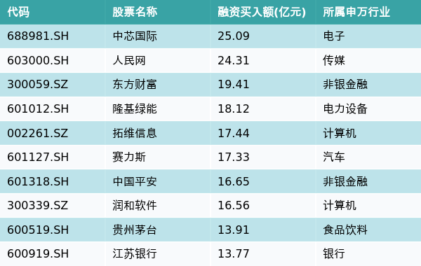 上周两市共有3280只个股有融资资金买入,共有17只个股买入金额超10亿元,其中中芯国际、人民网、东方财富排名前三,买入金额分别25.09亿元、24.31亿元、19.41亿元。融资买入额前10个股详情见下表: