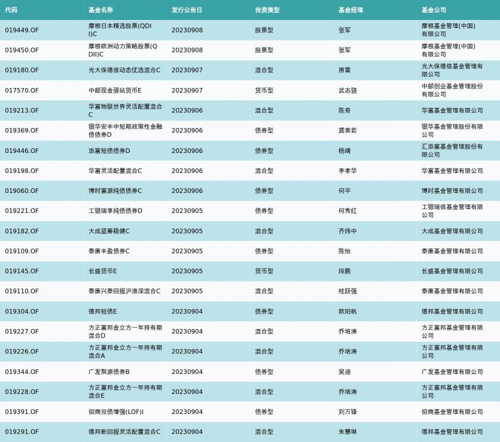 上周有21只新基金发行,分别为:摩根日本精选股票(QDII)C、摩根欧洲动力策略股票(QDII)C、光大保德信动态优选混合C、中邮现金驿站货币E、华富物联世界灵活配置混合C、银华安丰中短期政策性金融债债券D、添富短债债券D、华富灵活配置混合C、博时富源纯债债券C、工银瑞享纯债债券D、大成蓝筹稳健C、泰康丰盈债券C、长盛货币E、泰康兴泰回报沪港深混合C、德邦短债E、方正富邦金立方一年持有期混合D、方正富邦金立方一年持有期混合A、广发聚源债券B、方正富邦金立方一年持有期混合E、招商双债增强(LOF)I、德邦新回报灵活配置混合C,详情见下表: