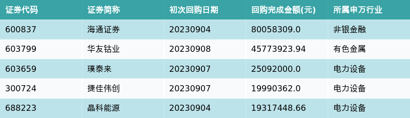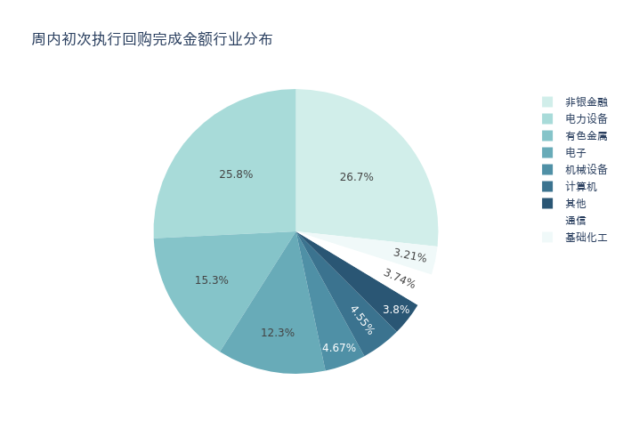 按照初次执行金额所在不同行业分布,金额最高的3个行业分别为:非银金融、电力设备、有色金属,详情见下图: