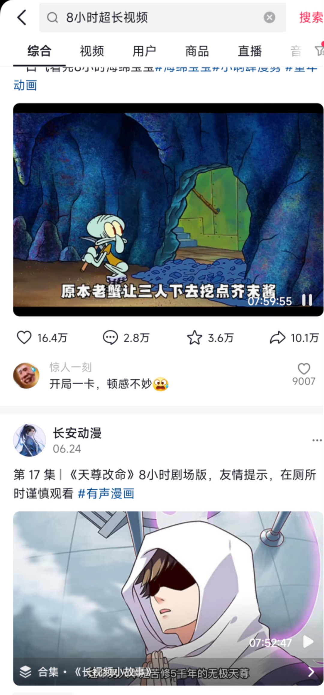 其原因在于,目前抖音视频上传的时长,很早就突破了15分钟的限制。如果用“8小时”为关键词进行搜索,很容易搜到一些有声小说、影视解说和赛事剪辑。