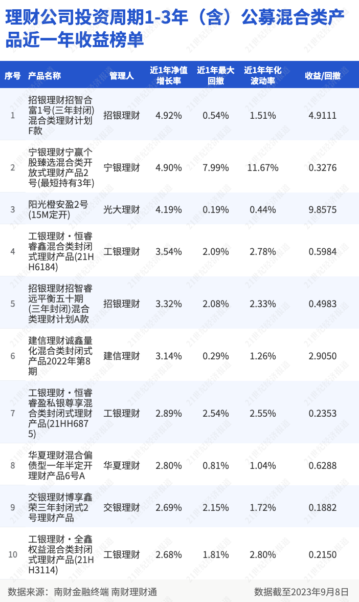 南财理财通数据显示,截至9月8日,在理财公司投资周期为1-3年(含)的公募混合类产品近一年收益排行榜中,7家理财公司产品上榜。工银理财上榜数量最多,达3只;招银理财上榜2只;宁银理财、光大理财、建信理财、华夏理财和交银理财各有1只产品上榜。