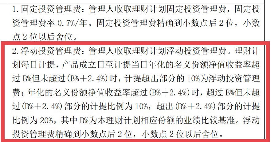 此外,该产品每日计提浮动管理费,当产品成立日至计提当日年化的名义份额净值收益率超过业绩基准但未超过(基准+2.4%)时,计提超出部分的10%为浮动投资管理费;年化的名义份额净值收益率超过(基准+2.4%)时,超过基准但未超过(基准+2.4%)部分的计提比例为10%,超出(基准+2.4%)部分的计提比例为20%。