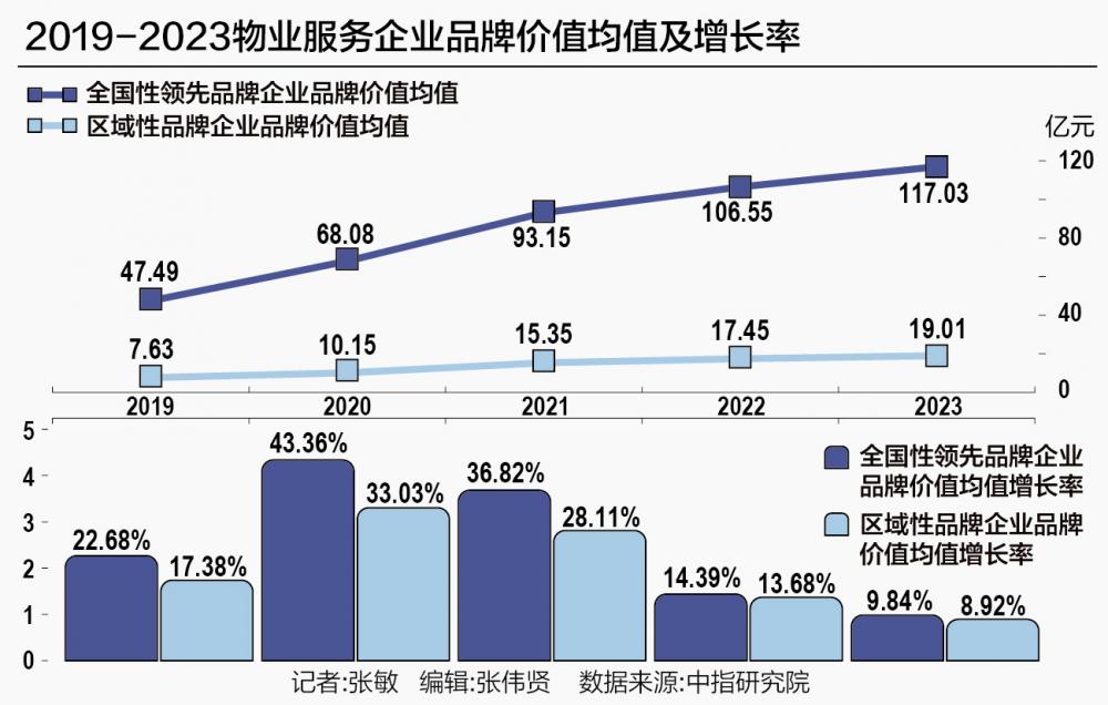 2023年,面对市场高增长预期压力,品牌企业坚定高质量发展目标,持续发力稳步提高管理规模,提升服务能力,深入落实品质聚焦战略,在行业波动的环境中,实现了品牌价值的稳步上涨。2023全国性物业服务领先品牌企业品牌价值均值为117.03亿元,同比增长9.84%;区域性物业服务品牌企业品牌价值均值为19.01亿元,同比增长8.92%。物业服务品牌价值的稳步提升,印证了行业发展加速向高质、高效的品牌化方向精进。