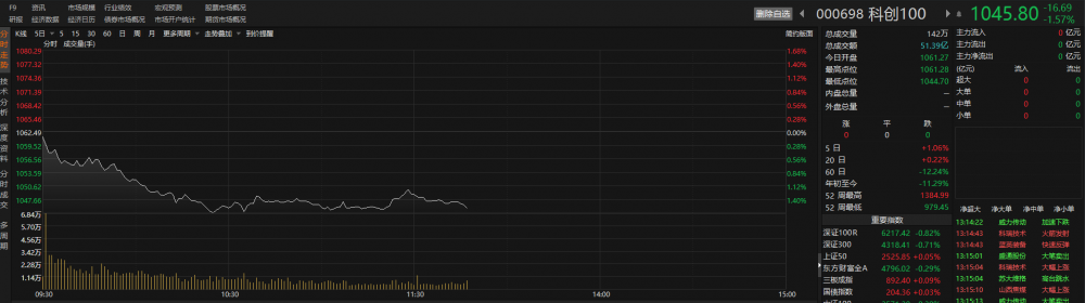 科创100指数(000698)午后低位盘整,截至发稿,该指数下跌1.57%。