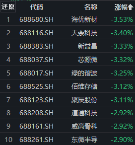 近9成成分股下跌。其中,海优新材、天奈科技、新益昌、芯源微、绿的谐波、佰维存储、聚辰股份均跌超3%;信科移动-U、百克生物、华秦科技等逆势上涨。