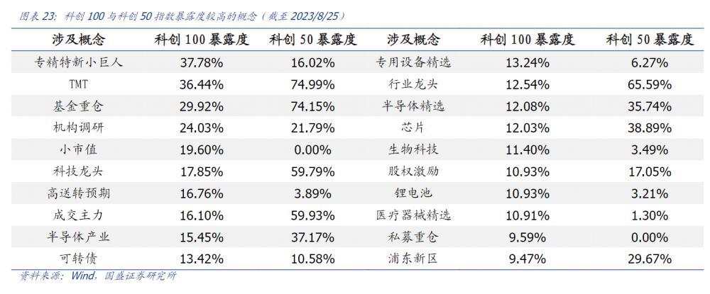 国盛证券近期研报指出,从指数成分股涉及概念来看,科创100指数在“专精特新”小巨人、TMT、科技龙头等概念上的暴露较高,科技主题特征鲜明。从具体相关概念来看,科创100指数在“专精特新”小巨人、TMT、科技龙头等概念的暴露度分别为37.78%、36.44%、17.85%,由此可见,指数成分股具备鲜明的科技属性。另外,科创100指数在基金重仓、机构调研等概念上暴露度也较高,说明指数成分股已受到市场一定程度的认可,并且具备较高的流动性。从与科创50指数的对比情况来看,科创100指数在“专精特新”小巨人、机构调研、小市值等概念上暴露度更高。