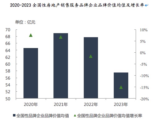 2022年以来,受部分房企品牌价值下降影响,行业品牌价值出现波动,整体承压下行。2022年全国性房地产销售服务品牌企业的品牌价值均值为57.42亿元,较上年降低15.17%。