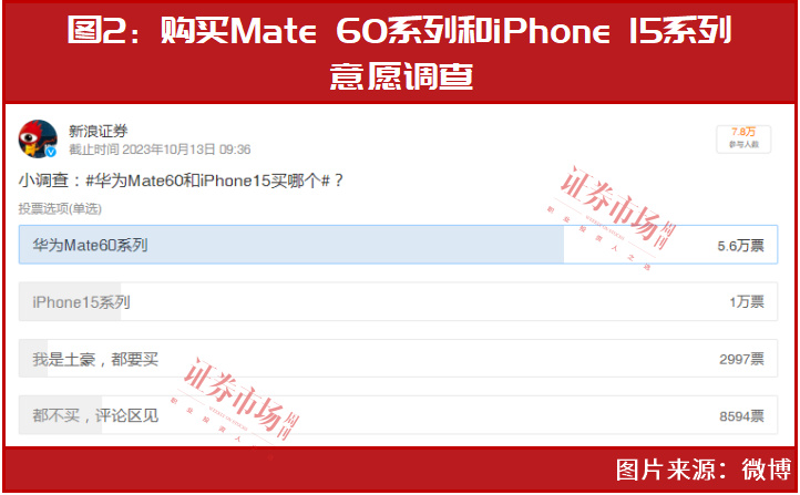 微博平台也有相关调查,且投票结果与东方财富网相似。如@新浪证券推出了主题为“华为Mate 60和iPhone 15买哪个”的调查,同样截至9月13日下午3点35分,共有7.8万人进行了投票,其中1万人选择iPhone 15系列,5.6万人选择Mate 60系列(见图2)。