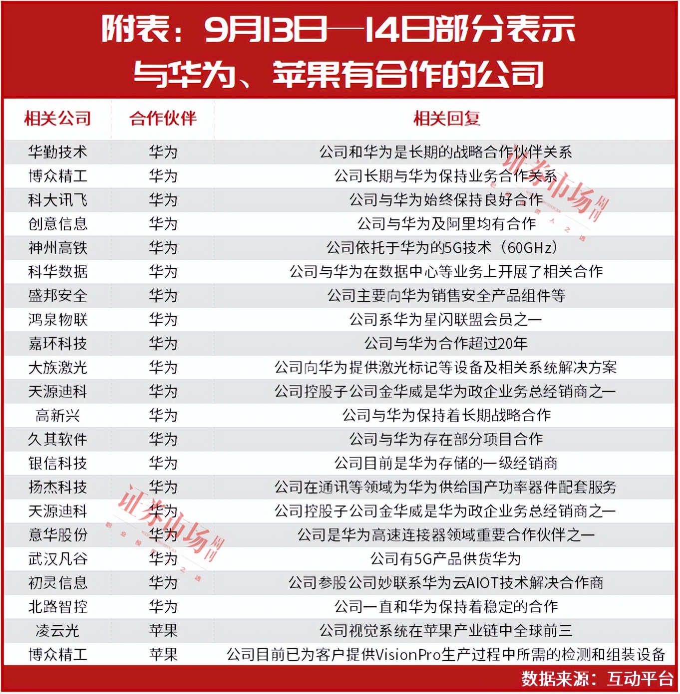 其中,华勤技术、博众精工和科大讯飞等多家公司明确表示,与华为或者苹果有相关合作。如从事智能硬件产品的华勤技术在互动平台表示,“公司和华为是长期的战略合作伙伴关系,同时也是华为惟一横跨手机、平板电脑、笔记本电脑、穿戴、AIOT、服务器等多个领域业务的合作伙伴。”(见附表)