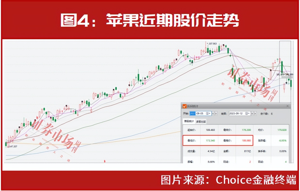 或是受此影响,苹果近期在二级市场表现一般。Choice金融终端显示,自继8月3日披露净利润下滑的三季报之后,苹果股价在8月整体下调明显,在随后的8月底9月初有所反弹,但自9月5日至今,公司股价再次迎来调整,最大跌幅接近9%(见图4)。