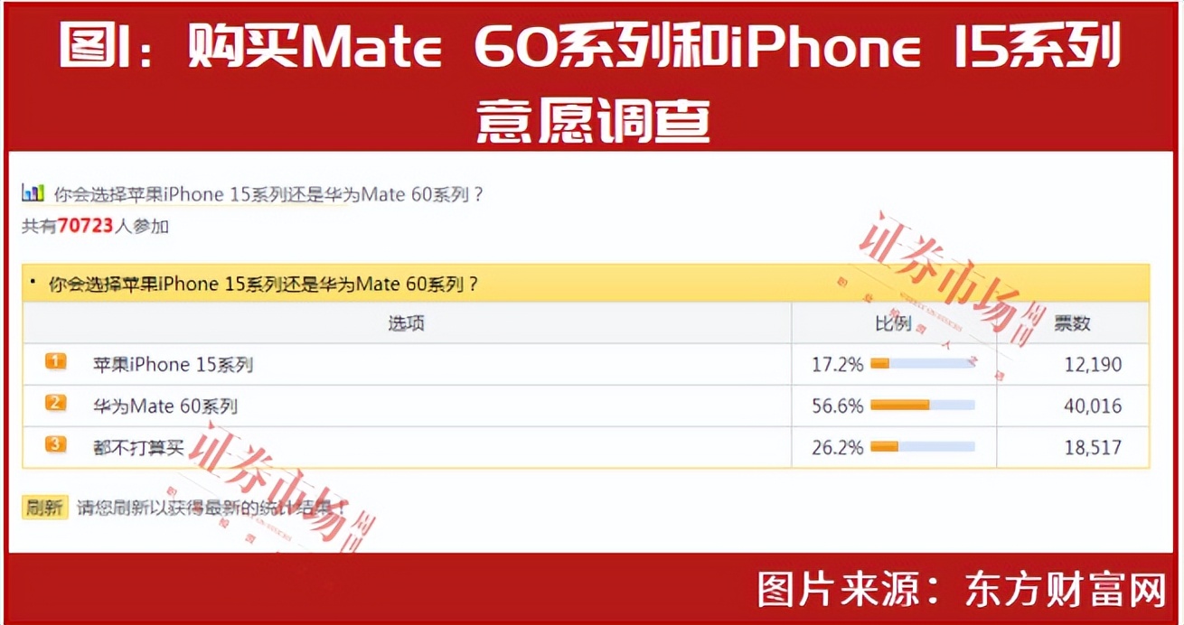 据观察,目前多个互联网平台推出了相关投票活动,如东方财富网,其推出了主题为“你会选择苹果iPhone 15系列还是华为Mate 60系列?”的调查,截至9月13日下午3点35分的调查结果显示,共有7万余人进行了投票,其中1.2万人选择iPhone15系列,4万人选择Mate 60系列,后者暂时更受大家喜爱(见图1)。
