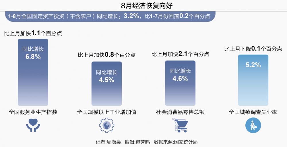 8月多项经济指标出现边际改善。比如,8月份,全国服务业生产指数同比增长6.8%,比上月加快1.1个百分点;全国规模以上工业增加值同比增长4.5%,比上月加快0.8个百分点;社会消费品零售总额同比增长4.6%,比上月加快2.1个百分点;货物进出口总额同比下降2.5%,降幅比上月收窄5.8个百分点;全国城镇调查失业率为5.2%,比上月下降0.1个百分点。