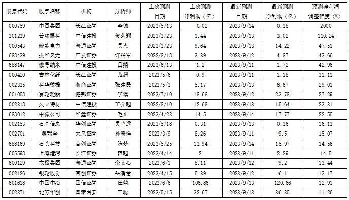获上调盈利预测值幅度超10%的公司
