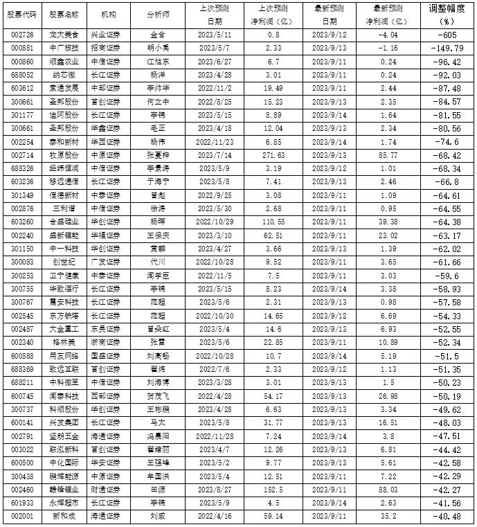 被下调盈利预测值幅度超40%的公司