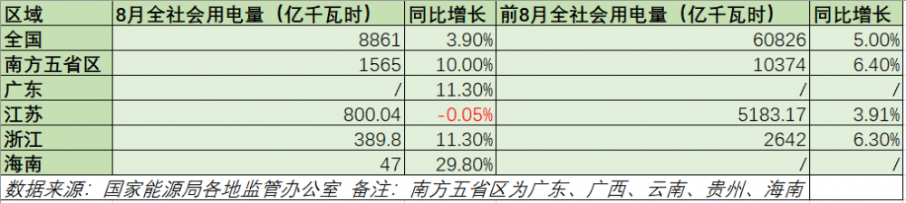 8月,全社会用电量8861亿千瓦时,同比增长3.9%,同时,1-8月,全社会用电量累计60826亿千瓦时,同比增长5.0%。