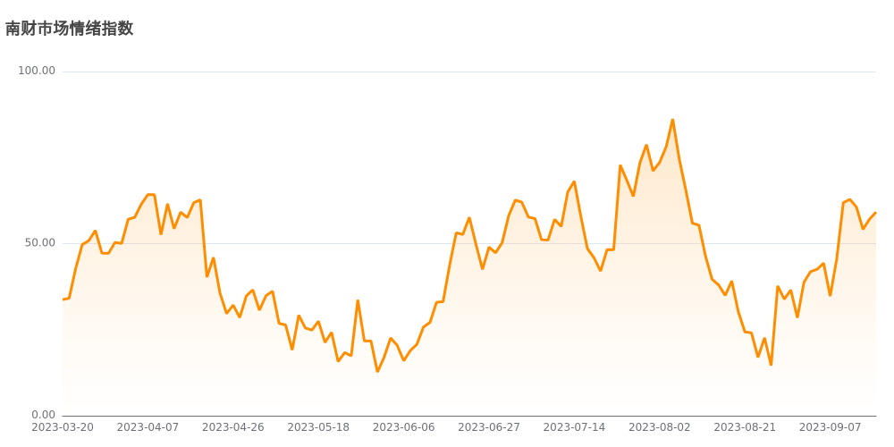 今日南财市场情绪指数为59.2,较前一交易日57.1上涨,市场投资热度提升。