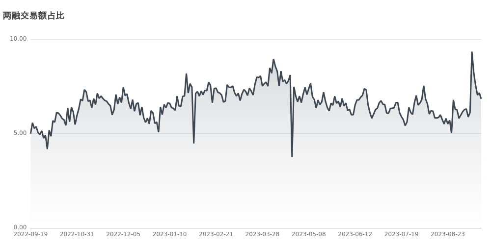 今日该指标值为6.84%,目前该指标处于近一年中立区间,说明投资者对A股持2中立情绪。反映场内投资者借钱炒股的杠杆水平,该指标越高说明杠杆水平越高,即投资者认为当前市场较强,反之则说明投资者认为市场相对较弱,因而与上证指数存在较强的正相关性。