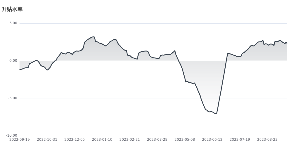 今日该指标值为2.31%,目前该指标处于近一年较高区间,说明投资者认为当前A股市场相对较强。反映期货市场投资者对市场的看法,该指标越高说明投资者认为当前市场较强,越低则说明认为市场相对较弱,因而与上证指数正相关。