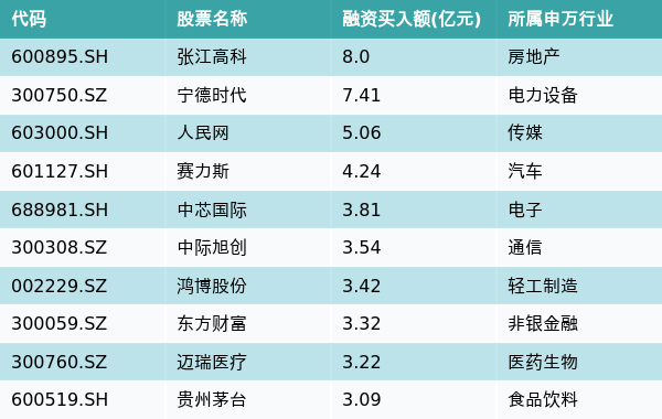 9月18日,两市共有3282只个股有融资资金买入,其中张江高科、宁德时代、人民网排名前三,买入金额分别8.0亿元、7.41亿元、5.06亿元。融资买入额前10个股详情见下表: