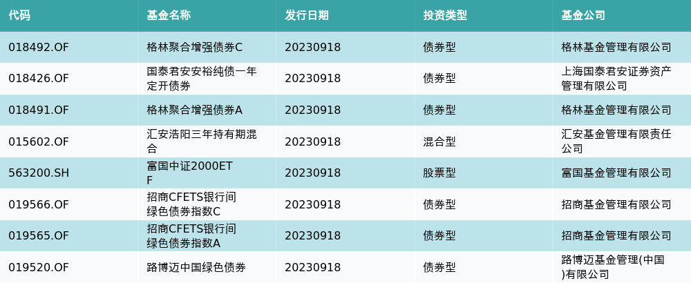 9月18日有8只新基金发行,分别为:格林聚合增强债券C、国泰君安安裕纯债一年定开债券、格林聚合增强债券A、汇安浩阳三年持有期混合、富国中证2000ETF、招商CFETS银行间绿色债券指数C、招商CFETS银行间绿色债券指数A、路博迈中国绿色债券,详情见下表: