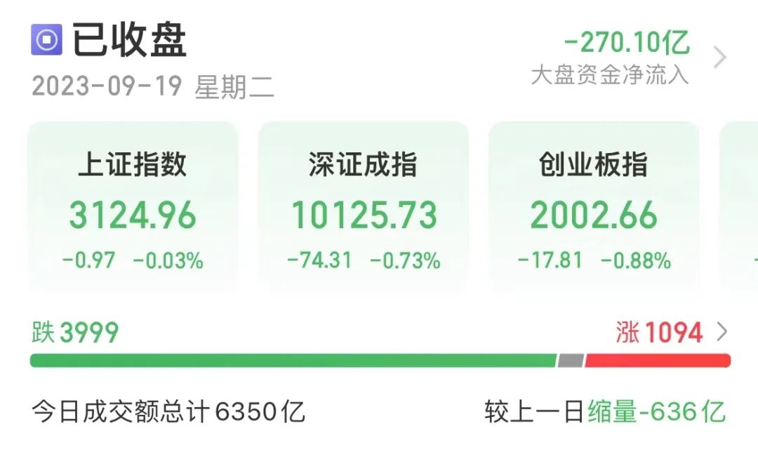9月19日,A股各主要指数走势分化,上证指数下跌0.03%,深证成指跌0.73%;创业板指下跌0.88%,盘中再度跌破2000点大关。板块跌多涨少,社会服务、美容护理两个板块均跌超2%,计算机、传媒、国防军工等多个行业跌超1%。