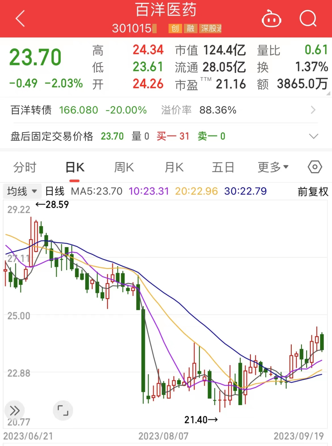资料显示,百洋转债是今年5月上市的次新转债,今天盘中创出的高点即为年内的最高价。以此计算,该转债年内最大涨幅超过140%。其正股是百洋医药,年内涨幅不足3%。从该股基本面来看,上半年实现营收36.35亿元,同比下降2.57%;归母净利润3.02亿元,同比增长39.76%。