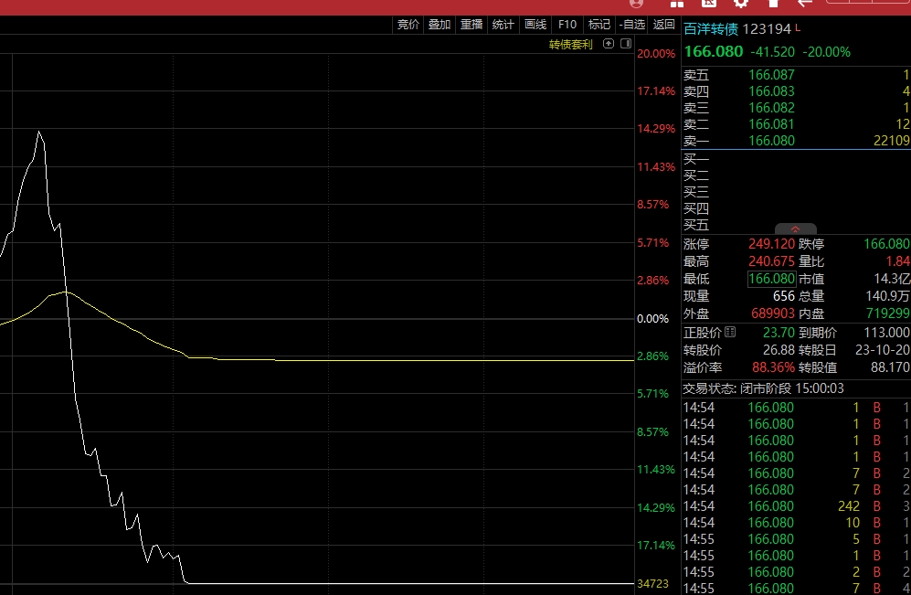 早盘,百洋转债一度上演低开高走戏码,从下跌近6%拉升至涨超6%,并在午后几分钟内继续狂拉,最高涨幅超过14%。不过好景不长,13点04分左右,百洋转债突然大幅跳水,5分钟“砸至水下”,不到30分钟即封死20cm跌停板。从盘中表现来看,百洋转债最高价达到240.675元;收盘价为166.08元,短短半个小时暴跌31%。