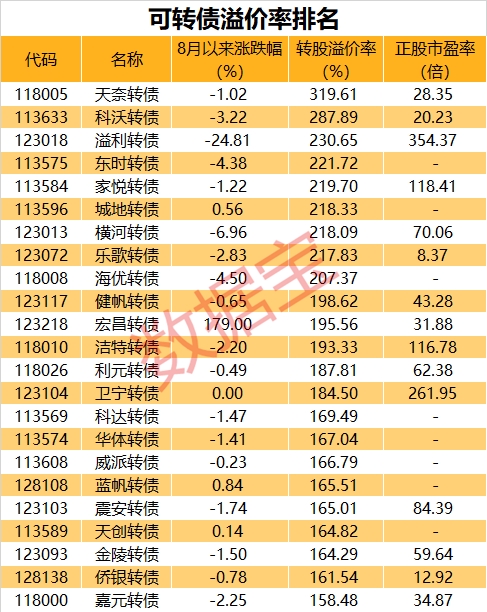 数据宝统计,截至目前,有多达58只可转债转股溢价率超过100%,136只可转债转股溢价率在50%至100%。具体来看,天奈转债转股溢价率高达319.61%,位居首位;科沃转债、溢利转债、东时转债、家悦转债等转股溢价率超过200%。