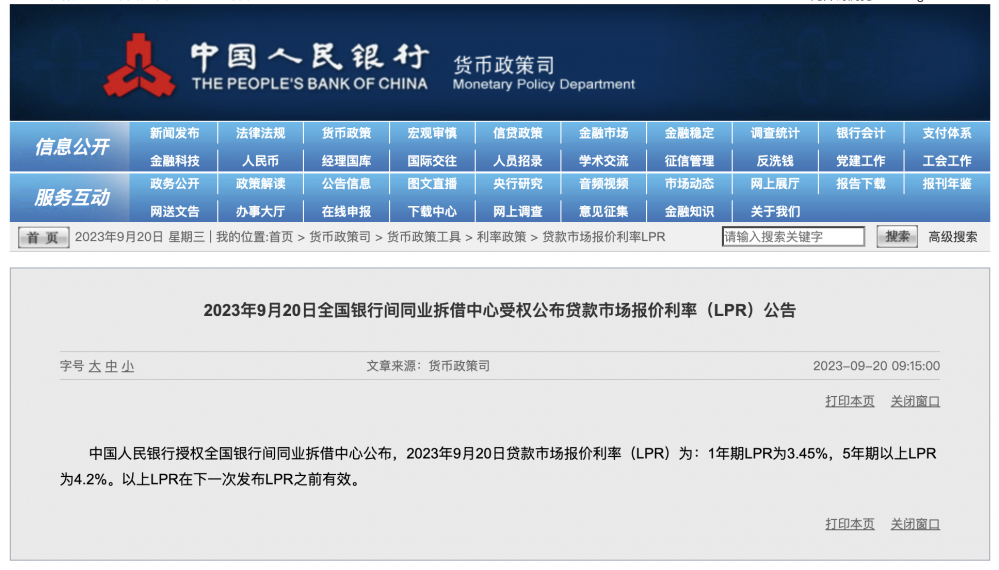 中国人民银行授权全国银行间同业拆借中心公布,2023年9月20日贷款市场报价利率(LPR)为:1年期LPR为3.45%,上月为3.45%;5年期以上LPR报4.2%,上月为4.2%。以上LPR在下一次发布LPR之前有效。