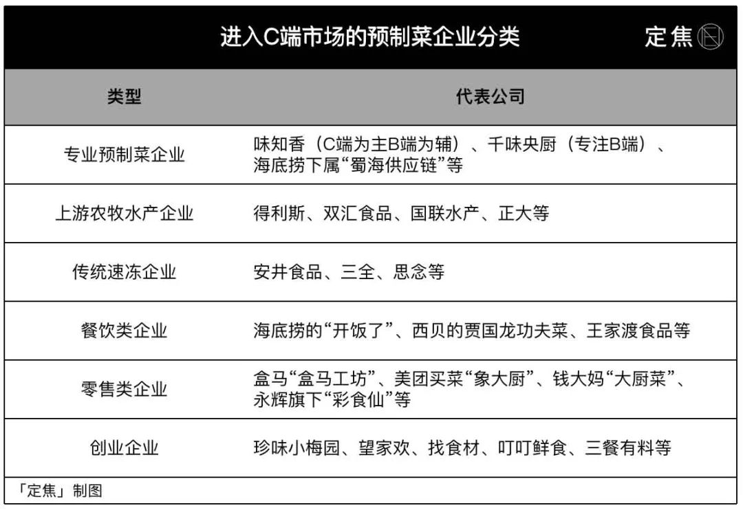 加入C端预制菜大军的,包括味知香这样的专业预制菜公司,得利斯这样的水产公司,三全、思念等传统速冻企业,还有离消费者最近的餐饮连锁,如海底捞、西贝等,零售类玩家如盒马、永辉、美团买菜等,以及一大批创业公司。