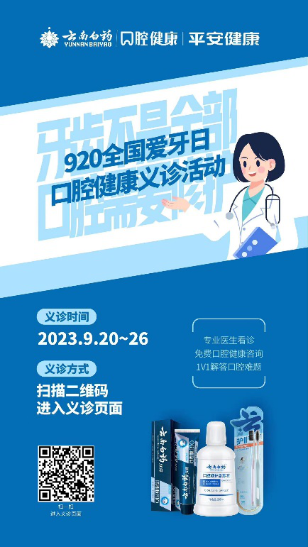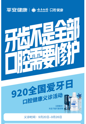 9月20日,在全国爱牙日之际,平安健康联合云南白药口腔健康启动为期一周的口腔健康科普义诊活动。今年爱牙日主题为“口腔健康 全身健康”,为了让更多人关注口腔健康,本次活动将通过线上平台,由平安家医提供专业的口腔检查和诊疗建议,为 300 位民众提供免费的医疗服务和健康科普,解答口腔问题,提升健康意识。