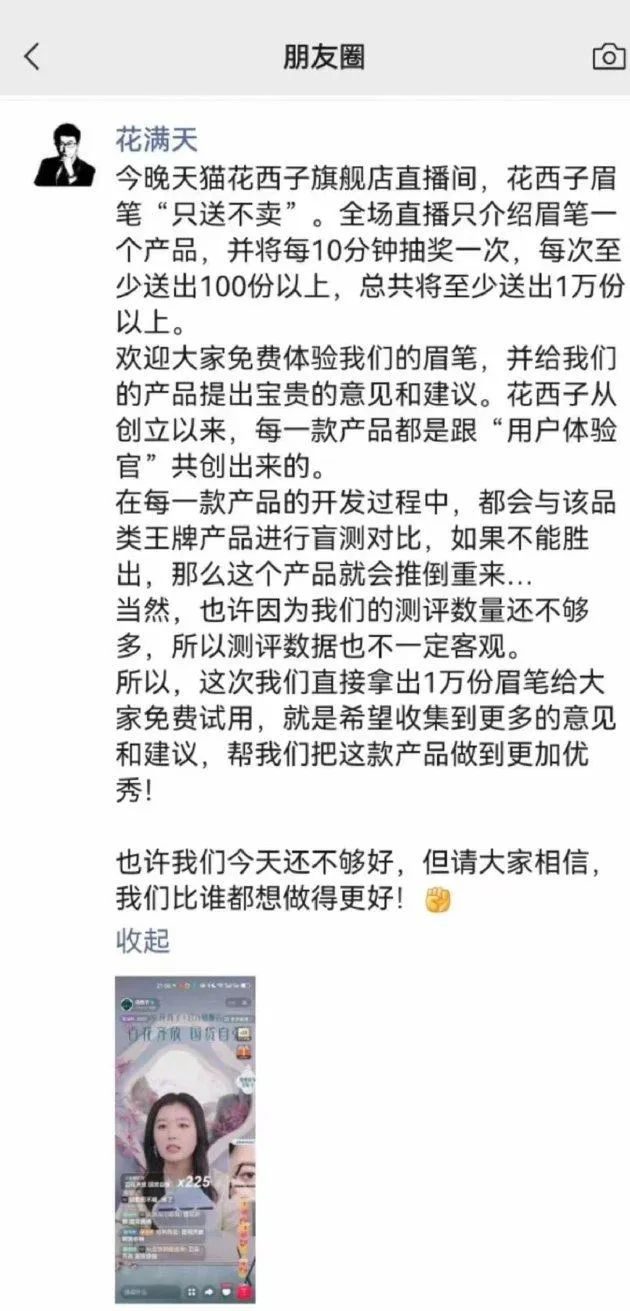 被员工戳穿了小聪明,花西子创始人“花满天”不得已松了松荷包,在朋友圈宣布“今晚天猫花西子旗舰店直播间,花西子眉笔‘只送不买’……总共将送出1万份以上。”