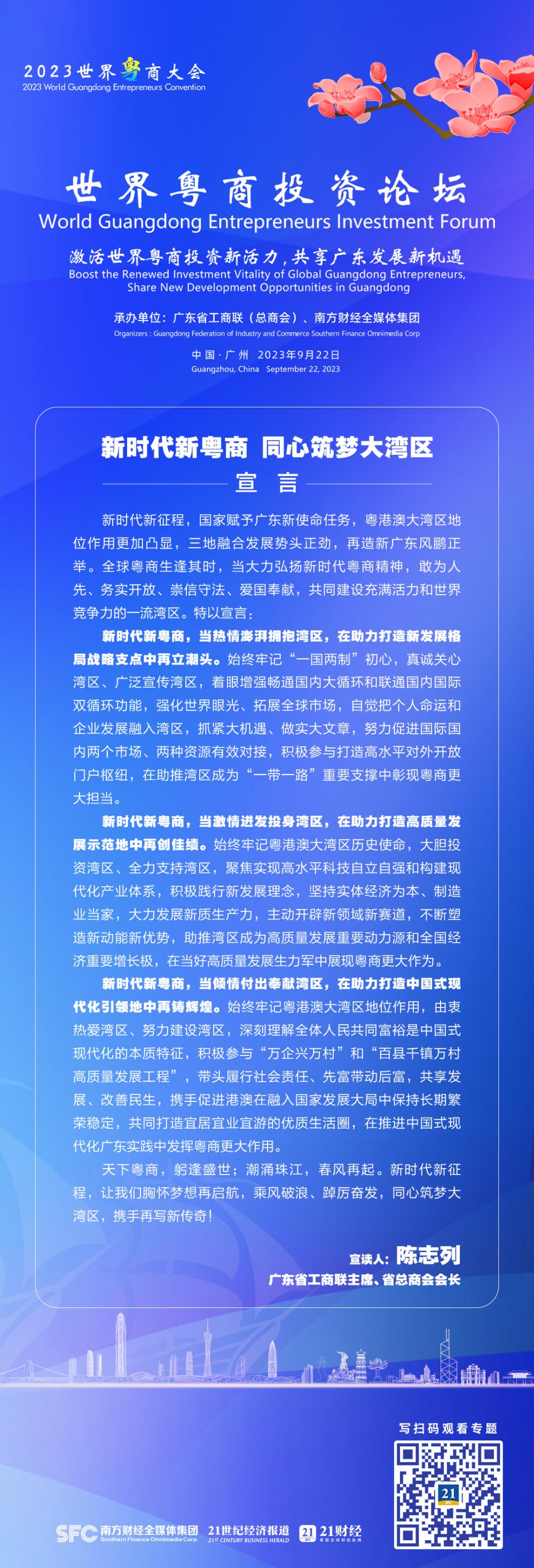 在9月22日举行的2023世界粤商大会开幕式上,广东省工商联主席、省总商会会长,研祥高科技控股集团董事局主席陈志列代表参会全体粤商发出郑重宣言: