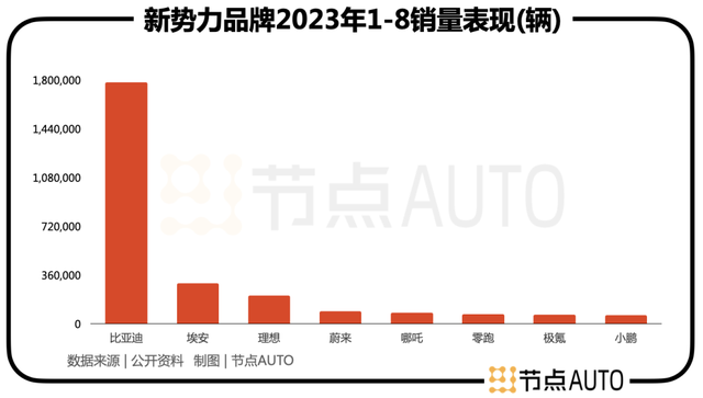 今年1-8月,国内新能源市场分为三个梯队。第一梯队成员只有比亚迪,销量超百万;第二梯队成员有两个,分别是埃安和理想(销量从大到小依次排序),销量都超过了20万辆;第三梯队的成员是蔚来、哪吒,它们的销量接近10万辆;第四梯队成员是零跑、极氪和小鹏,它们的销量都超过了6万辆。
