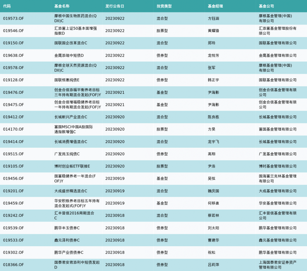 上周有21只新基金发行,分别为:摩根中国生物医药混合(QDII)C、汇添富上证50基本面增强指数D、国联国企改革混合C、金鹰添瑞中短债D、摩根全球天然资源混合(QDII)C、国联恒惠纯债E、创金合信添福平衡养老目标三年持有期混合发起(FOF)Y、创金合信增福稳健养老目标一年持有期混合发起(FOF)Y、长城新兴产业混合C、富国MSCI中国A股国际通指数增强C、长城消费增值混合C、广发民玉纯债C、博时创业板ETF联接E、国富稳健养老一年混合(FOF)Y、大成盛世精选混合C、华安积极养老目标五年持有混合发起式(FOF)Y、汇丰晋信2016周期混合C、鹏华丰玉债券C、鑫元泽利债券C、鹏华产业债债券C、国泰君安君添利中短债发起D,详情见下表: