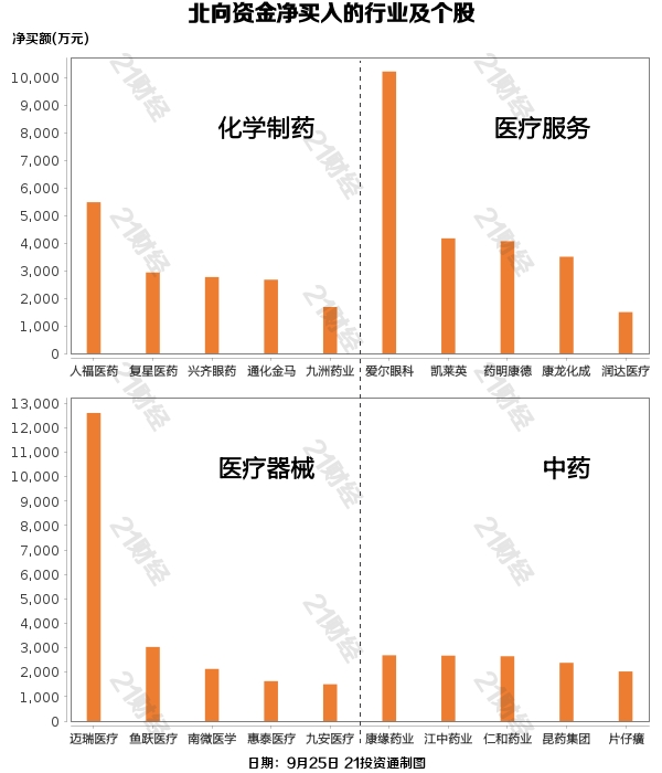 从净买入金额来看,北向资金增持了23个行业,其中化学制药居首,净买入金额达3.93亿元,其次是医疗服务行业,净买入3.04亿元。北向资金减持了77个行业,其中证券最多,净卖出金额达16.82亿元,其次是软件开发行业,净卖出8.57亿元。