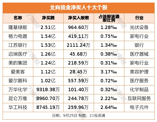 净买入隆基绿能2.51亿元,净卖出三花智控3.45亿元